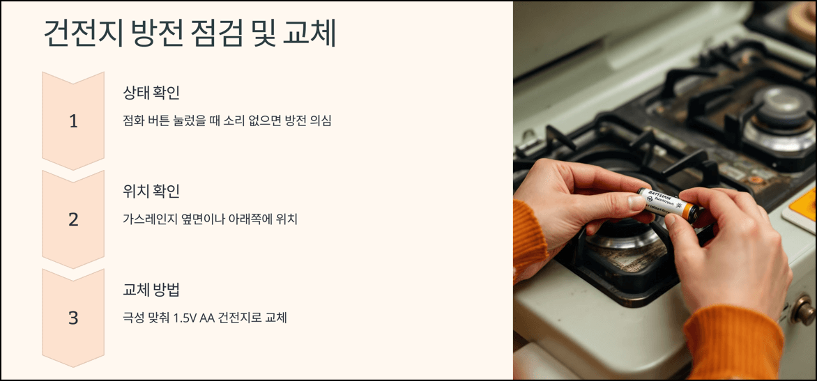 - 건전지 위치는 대부분 가스레인지 옆면이나 아래쪽에 있으며, 1.5V AA 건전지가 필요합니다.