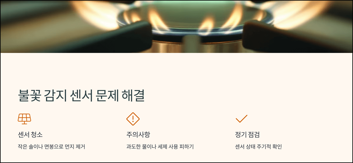 - 불꽃 감지 센서 관리: 먼지 제거 및 기름때 청소.