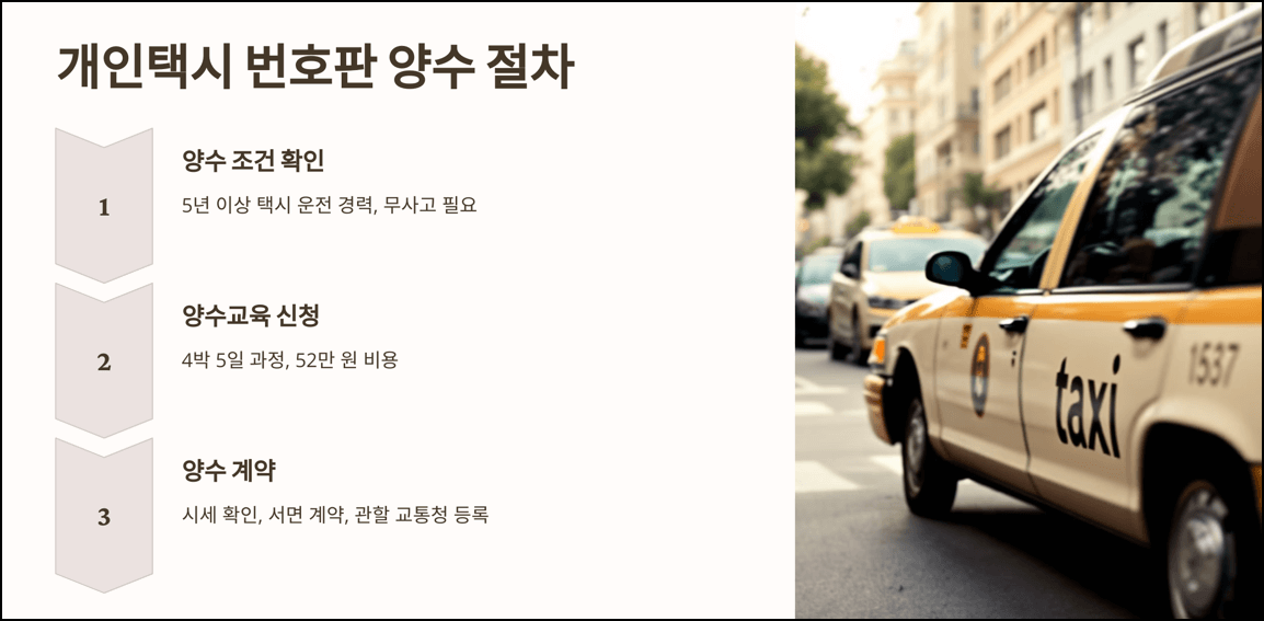 개인택시 번호판 양수는 개인택시를 운영하기 위해 필수적인 과정입니다. 다음은 번호판 양수의 절차와 관련된 중요한 정보를 정리한 내용입니다.