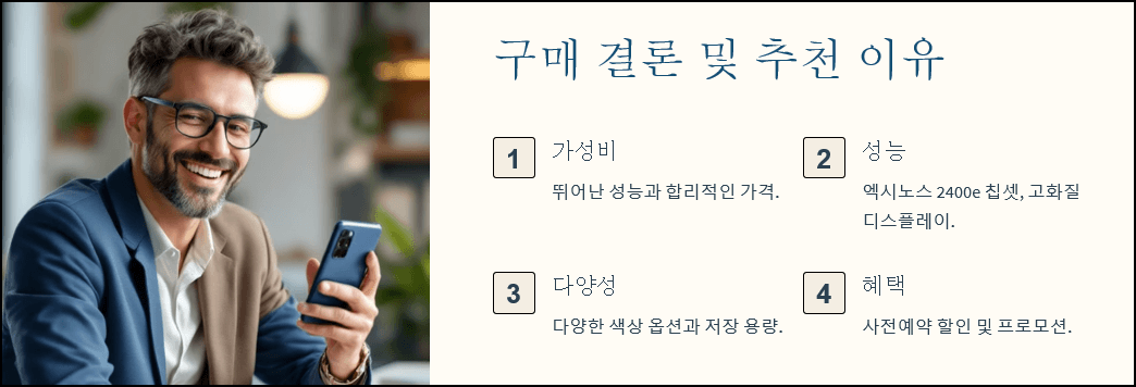 갤럭시 S24 FE는 가성비와 성능, 디자인을 모두 갖춘 스마트폰으로, 중급기를 찾고 있는 소비자들에게 적합한 제품입니다. 엑시노스 2400e 칩셋을 기반으로 뛰어난 성능을 제공하며, 고화질 디스플레이와 카메라 성능으로 미디어 소비와 촬영에 있어서도 만족스러운 경험을 제공합니다. 또한 다양한 프로모션과 혜택을 통해 가격적인 장점까지 누릴 수 있어, 예산을 고려하는 소비자들에게 매우 매력적인 선택입니다.