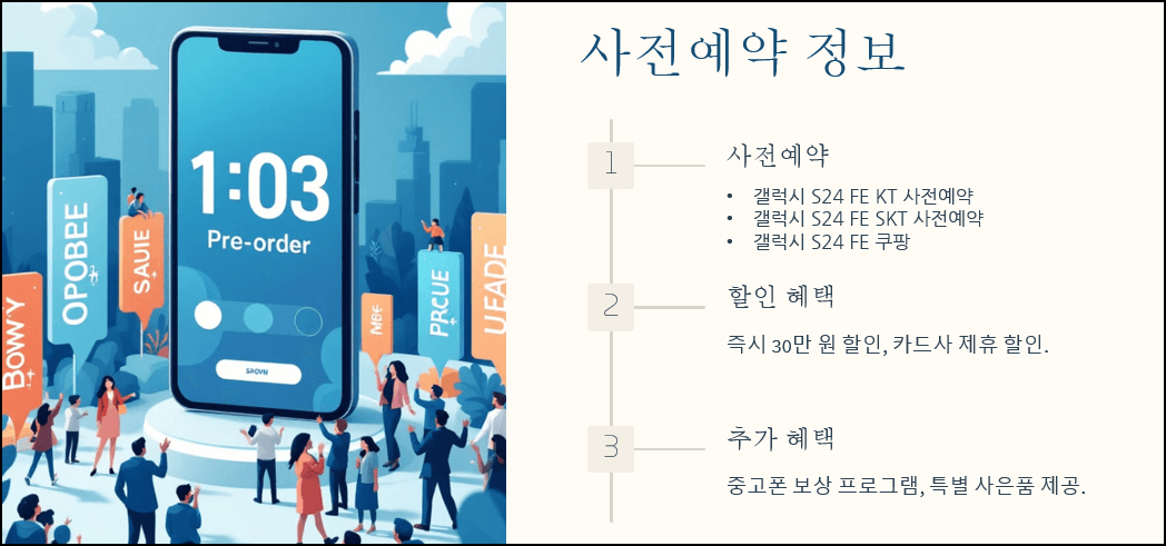 사전예약을 이용하는 주요 이점은 가격 할인이지만, 빠르게 제품을 받아볼 수 있다는 장점도 큽니다. 갤럭시 S24 FE의 경우, 사전예약이 끝나고 나면 물량이 한정되어 있어 일반 구매자들은 제품을 받기까지 시간이 더 걸릴 수 있습니다. 그렇기 때문에 갤럭시 S24 FE를 빠르게 손에 넣고 싶다면 사전예약을 추천합니다.