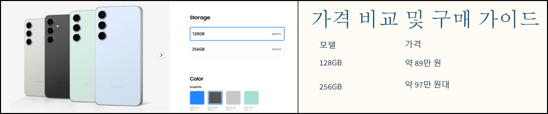 갤럭시 S24 FE의 가격은 모델에 따라 차이가 있습니다. 기본 모델인 128GB 모델의 가격은 약 89만 원이며, 256GB 모델은 97만 원대를 형성하고 있습니다. 이는 같은 시리즈의 상위 모델인 갤럭시 S24+와 비교했을 때 크게 저렴한 가격으로, 가성비를 중시하는 소비자들에게는 매력적인 선택이 될 것입니다.
