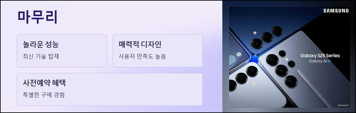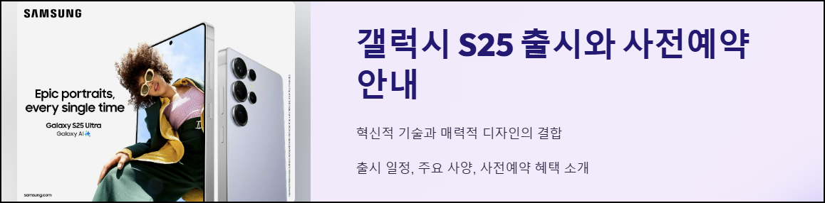 갤럭시 S25는 놀라운 성능과 매력적인 디자인으로 사용자들을 만족시킬 준비를 마쳤습니다. 사전예약을 통해 더 많은 혜택과 특별한 구매 경험을 누려보세요!