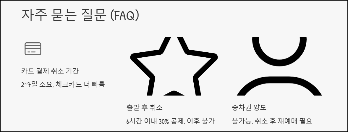 - 출발 후 6시간 이내 취소 시 요금의 30% 공제 후 환불됩니다.