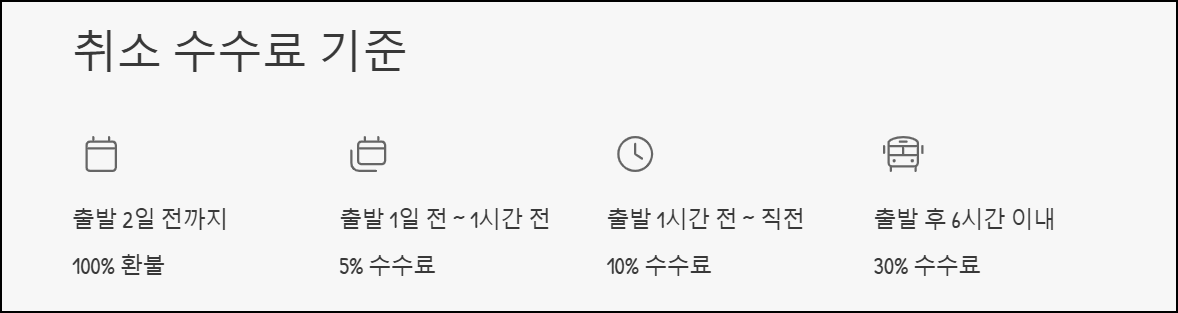 - 출발 1일 전 ~ 출발 1시간 전: 📝 승차권 요금의 5% 수수료 부과