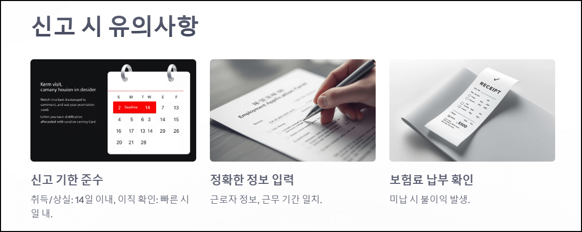 고용보험 신고 과정에서 지켜야 할 주요 사항들을 정리했습니다. 신고 기한을 준수하지 않으면 과태료 부과 및 실업급여 지급 지연 등의 불이익이 발생할 수 있습니다.