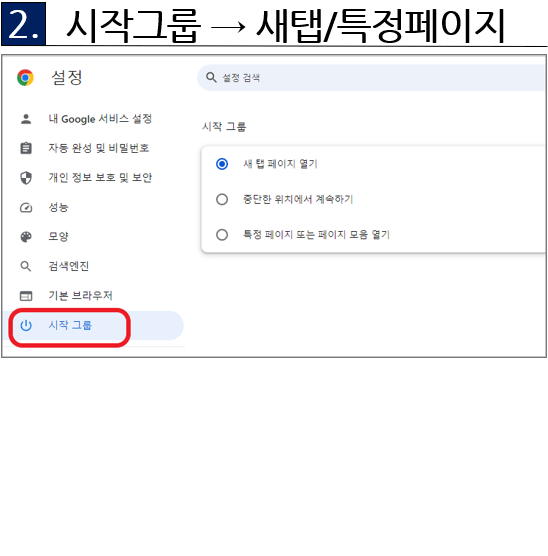 - 좌측의 시작그룹에서 원하는 시작페이지를 선택합니다.
