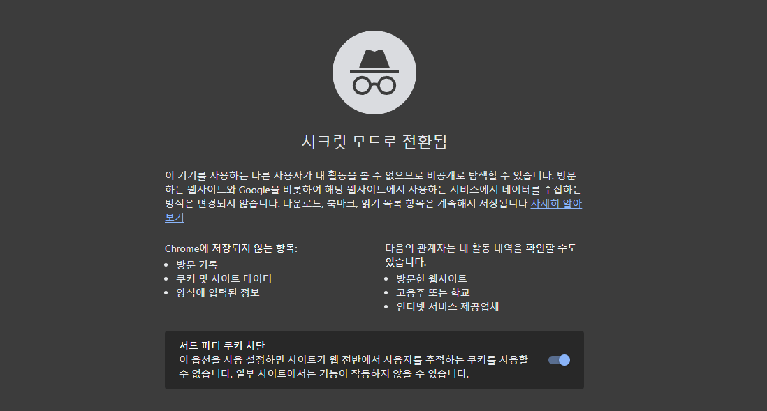 - 서드 파티 쿠키: 시크릿 모드에서는 타사 쿠키가 차단됨