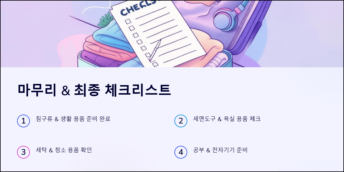 기숙사 생활을 위한 모든 준비가 끝났다면, 마지막으로 최종 점검을 해보세요!
