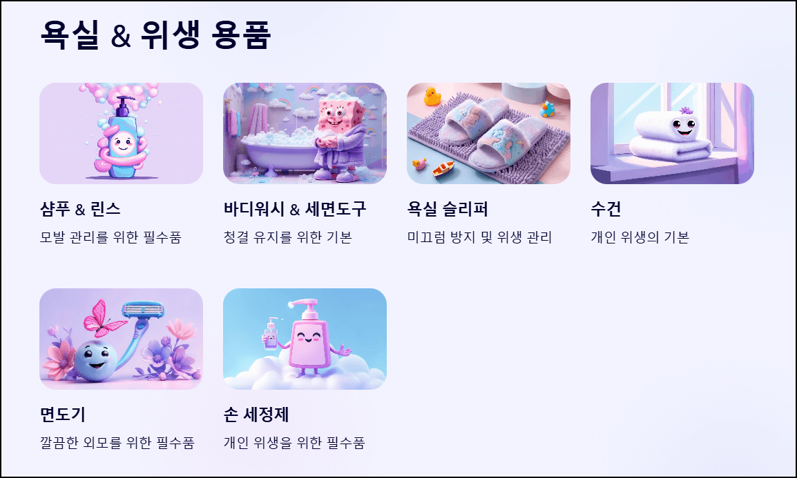 - 샴푸, 린스, 바디워시 - 세면도구 (칫솔, 치약, 양치컵)