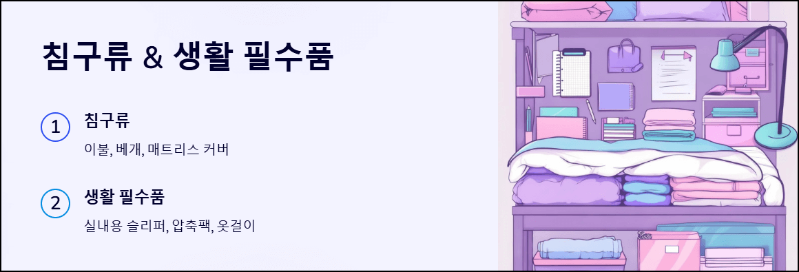 기숙사에서는 기본 매트리스만 제공되는 경우가 많아 침구류는 꼭 준비해야 합니다. 또한 좁은 공간에서도 편리하게 사용할 수 있는 생활 필수품도 챙겨가면 좋아요!