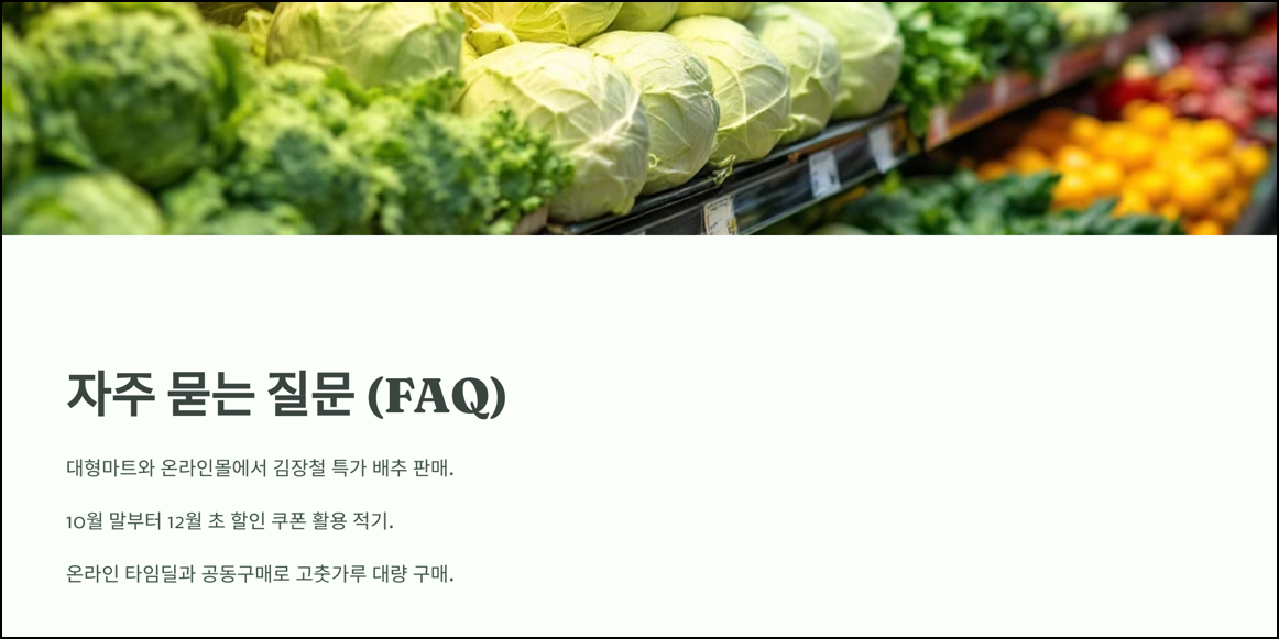 A2. 김장철 할인 행사는 보통 10월 말부터 12월 초까지 진행되므로, 이 시기에 대형마트 앱이나 온라인몰에서 쿠폰을 미리 받아두면 좋습니다. - Q3. 고춧가루 대량 구매가 가능한 곳은 어디인가요?