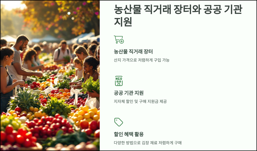 - 주말 농산물 직거래 장터: 서울과 수도권 지역에서는 김장철마다 주말마다 열리는 농산물 직거래 장터를 찾을 수 있습니다. 배추와 무 외에도 부재료를 저렴하게 구입할 수 있어, 한 번에 김장 재료를 준비하기에 좋습니다.