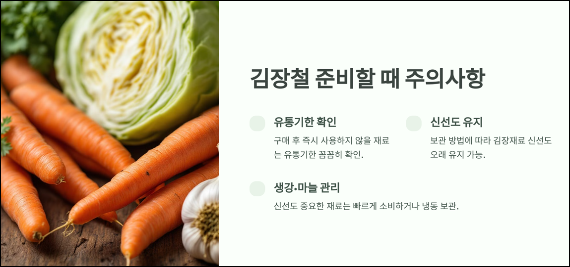 김장철에 대량으로 재료를 구입하다 보면 자칫 유통기한이 짧은 재료들을 지나칠 수 있습니다. 특히 생강과 마늘처럼 신선도가 중요한 재료들은 구매 후 빠르게 소비하는 것이 중요합니다. 다음은 김장철 준비 시 유의할 몇 가지 포인트입니다.