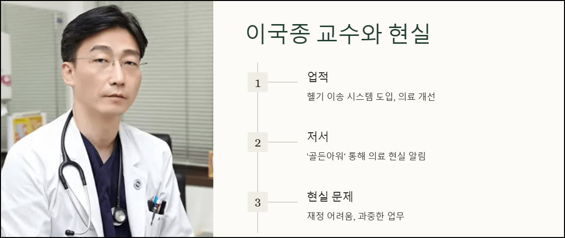 - 이국종 교수는 외상외과 전문의로서 자신의 경험을 바탕으로 '골든아워'라는 책을 집필했습니다.