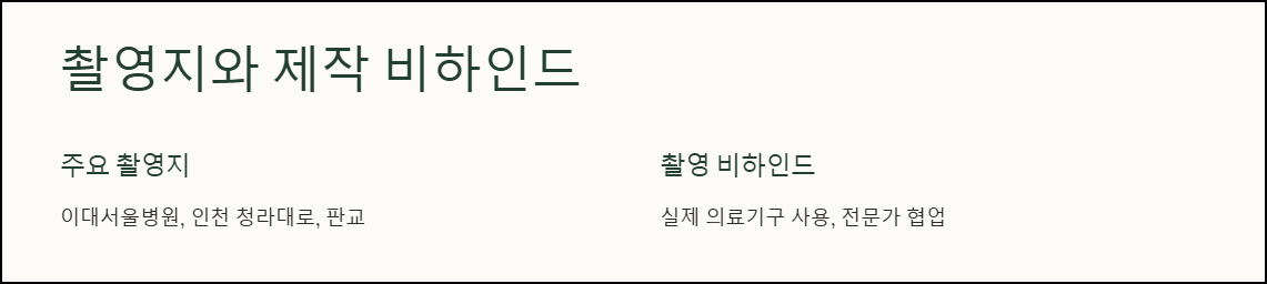 - 병원 내부 세트는 의료진과 협력하여 세밀하게 제작.