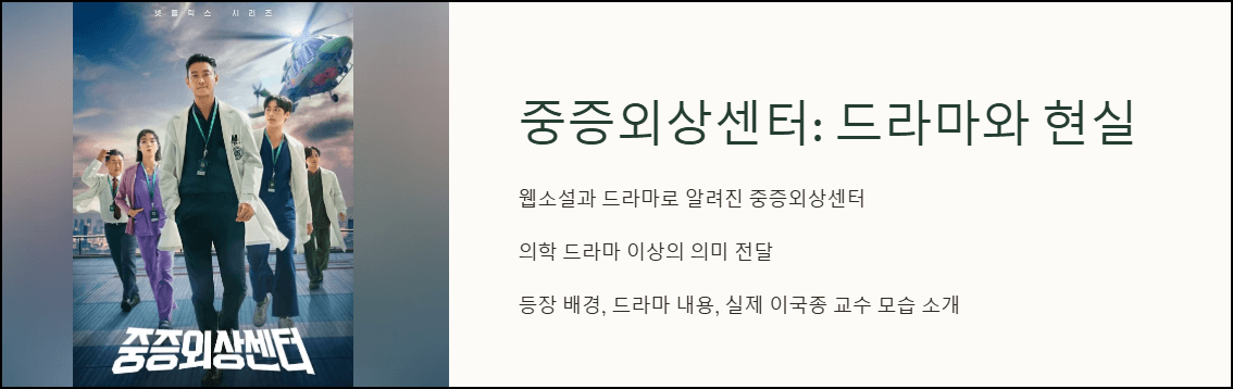 이 글에서는 중증외상센터의 등장 배경과 드라마의 내용, 그리고 실제 현실 속 이국종 교수의 모습까지 다양한 시각에서 중증외상센터를 알아보겠습니다.