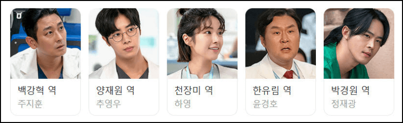 - 천장미: 외상센터 5년 차 간호사로 책임감 강한 인물. (하영)