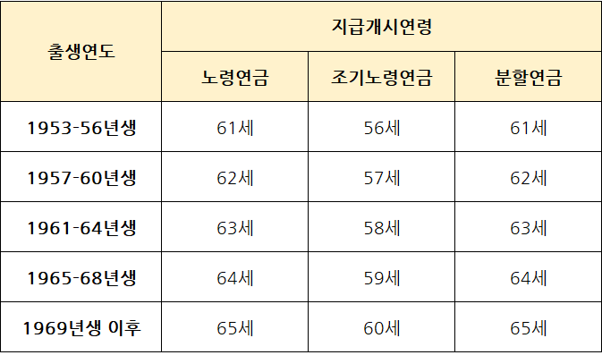 - 아래 표와 같이 출생연도별로 지급되는 나이가 다릅니다. 1969년 이후 출생자의 경우 만 65세까지 연령이 상향 조정되었습니다.