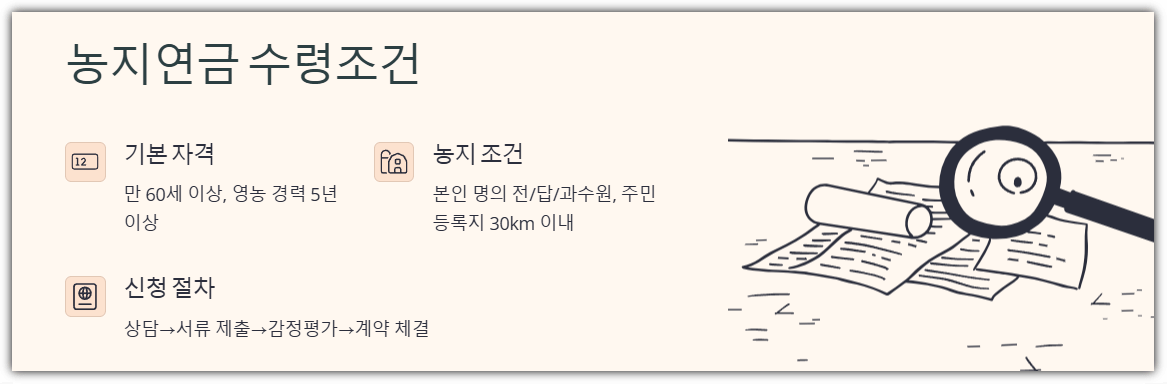 농지연금은 가입 연령과 영농 경력, 농지 조건을 충족해야 하며 단순한 농지 보유만으로는 자격이 주어지지 않습니다.