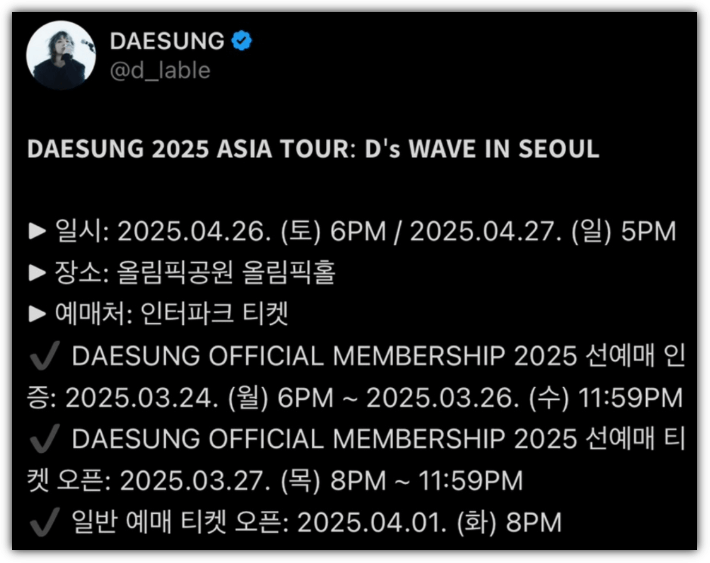 - 공연명: DAESUNG 2025 ASIA TOUR: D’s WAVE IN SEOUL