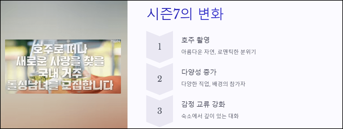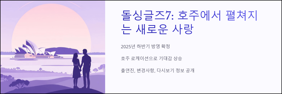 MBN 대표 연애 예능 '돌싱글즈7'이 2025년 하반기 방영을 확정했습니다. 이번 시즌은 호주에서 촬영되어 더욱 기대를 모으고 있는데요.