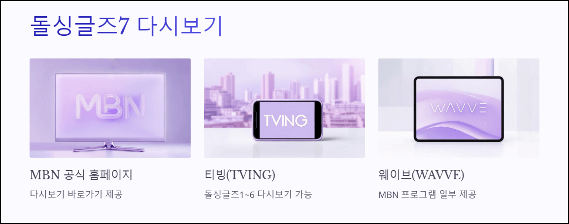 MBN 및 다양한 OTT 플랫폼을 통해 '돌싱글즈7'을 다시 볼 수 있습니다.