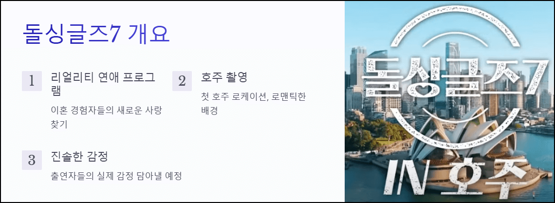 '돌싱글즈'는 이혼의 경험이 있는 돌싱 남녀가 출연해 새로운 사랑을 찾는 과정을 담은 리얼리티 연애 프로그램입니다. 시즌 7은 호주에서 진행되는 첫 번째 시즌으로, 더욱 로맨틱한 배경 속에서 출연자들의 진솔한 감정을 담아낼 예정입니다.