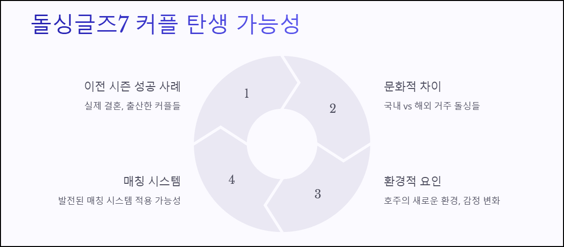 '돌싱글즈'는 매 시즌마다 실제 커플을 탄생시키며 큰 화제를 모았습니다. 이번 시즌7 역시 다양한 돌싱 남녀들이 호주에서 새로운 사랑을 찾을 것으로 기대됩니다.