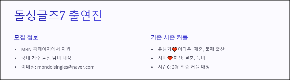 현재 MBN 공식 홈페이지에서는 돌싱글즈7 출연진을 모집 중이며, 최종 출연자는 방영일에 맞춰 공개될 예정입니다.