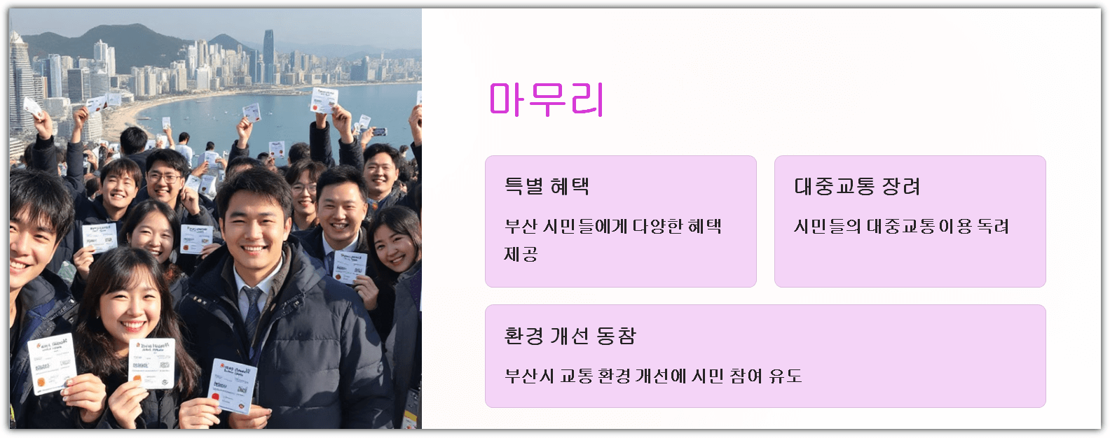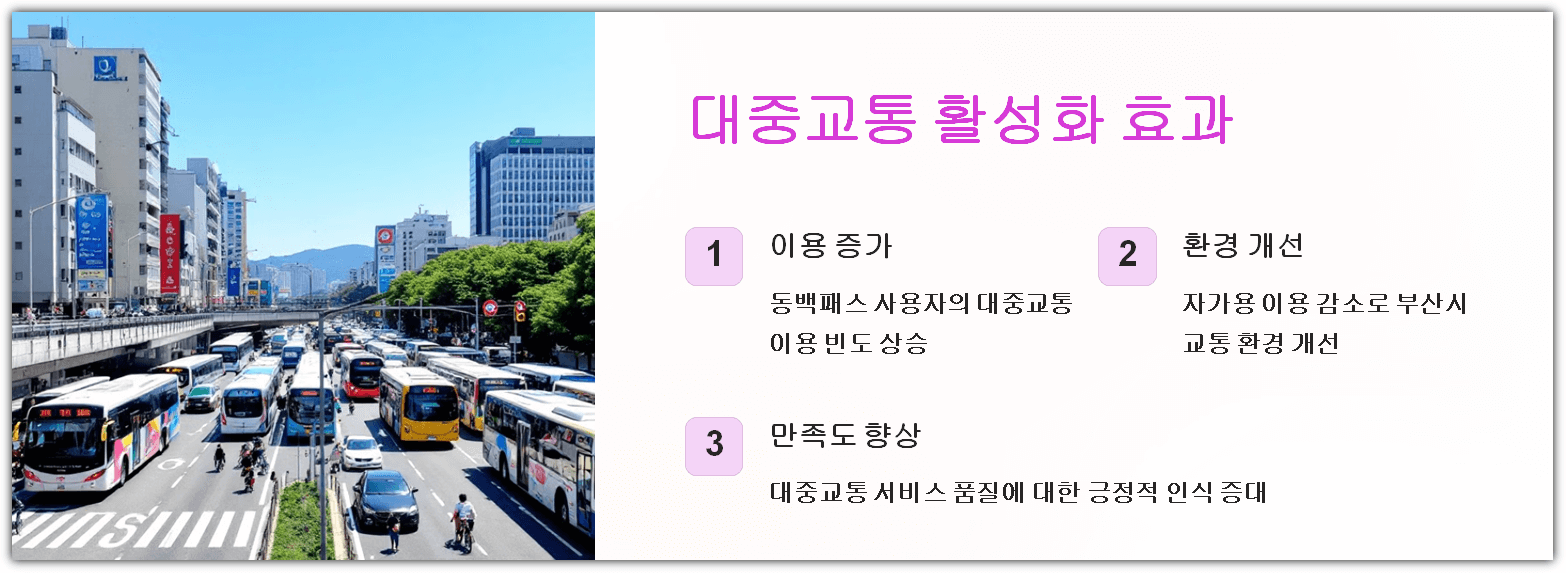 - 부산시 교통 환경 개선: 자가용 이용을 줄이고 대중교통을 활성화하여 부산시 교통 환경 개선
