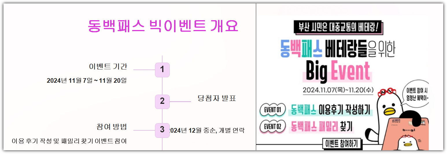 동백패스 빅이벤트는 부산 시민들의 대중교통 이용에 감사하는 마음을 담아, ‘이용 후기 작성’과 ‘패밀리 찾기’로 나뉘어 진행됩니다. 2024년 11월 7일부터 20일까지 열리는 이번 이벤트에 참여하고 다양한 혜택을 누리세요.