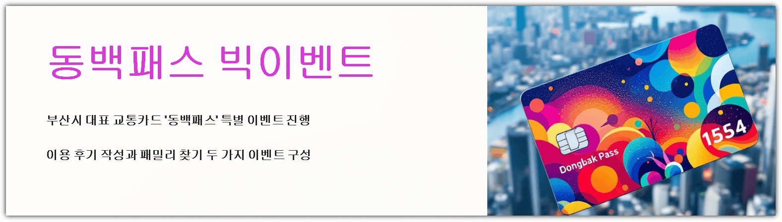 부산시의 대표 교통카드 ‘동백패스’가 특별한 이벤트로 시민들에게 감사의 마음을 전하고 있습니다. 이번 이벤트는 ‘동백패스 이용 후기 작성’과 ‘패밀리 찾기’ 두 가지 이벤트로 구성되어 있으며, 부산 시민이라면 누구나 쉽게 참여할 수 있습니다.
