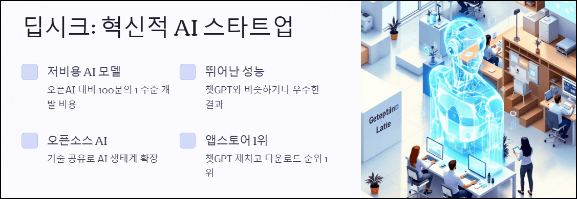 - 저비용 AI 모델: 개발 비용이 오픈AI 대비 약 100분의 1 수준