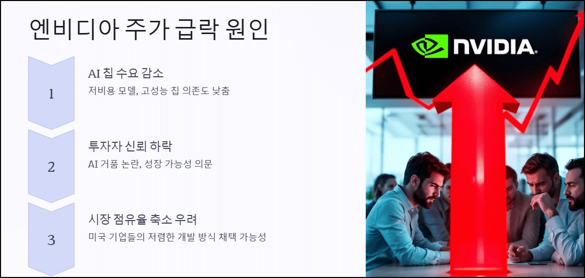 딥시크의 성공은 엔비디아와 같은 반도체 기업에 직접적인 영향을 미쳤습니다. 특히 AI 모델의 개발 비용 효율성과 저렴한 GPU 활용 방식이 시장의 패러다임을 바꾸며 엔비디아 주가의 급락을 초래했습니다.