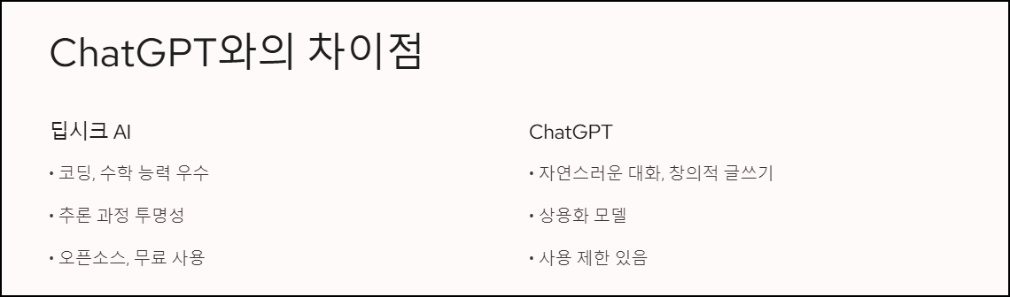 - 딥시크는 오픈소스 모델로 누구나 무료로 사용할 수 있으며, ChatGPT는 상용화 모델로 사용에 제한이 있습니다.