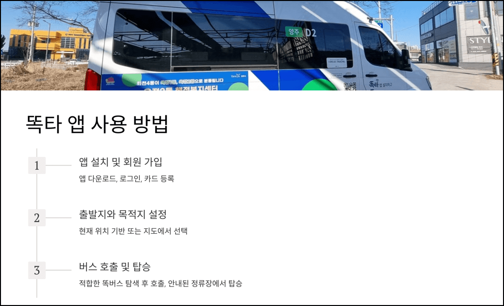 사용자가 똑타 앱으로 버스를 호출하면, 가장 가까운 정류장에서 탑승할 수 있도록 안내하며, 합승을 통해 보다 효율적인 이동을 지원합니다. - 운행 지역