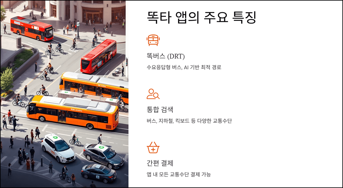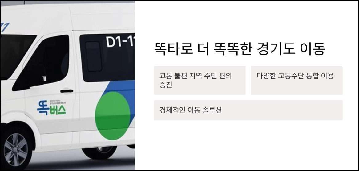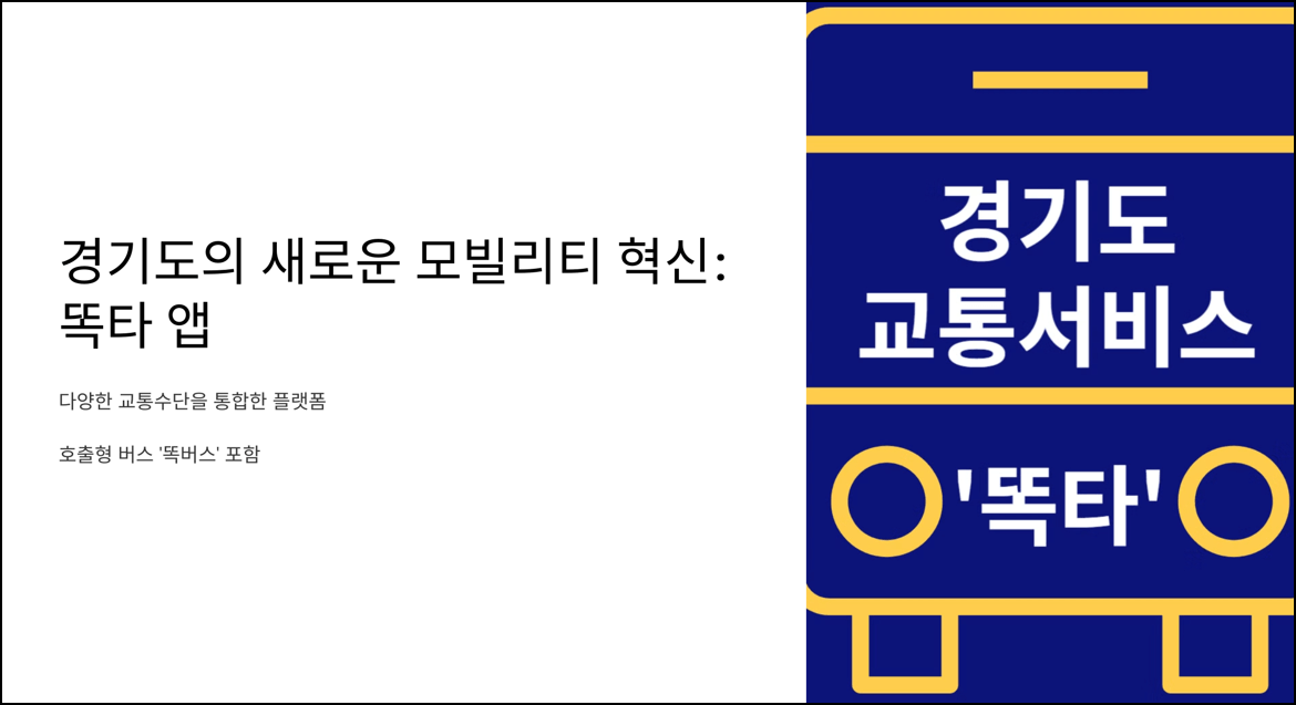 경기도의 새로운 모빌리티 혁신, 똑타 앱을 소개합니다. 똑타 앱은 호출형 버스인 똑버스를 포함하여 다양한 교통수단을 한 번에 이용할 수 있는 통합 모빌리티 플랫폼입니다. 이제 경기도 내 여러 지역에서 똑타 앱 하나로 손쉽게 이동하고, 교통비를 절감할 수 있는 방법을 알아보세요.