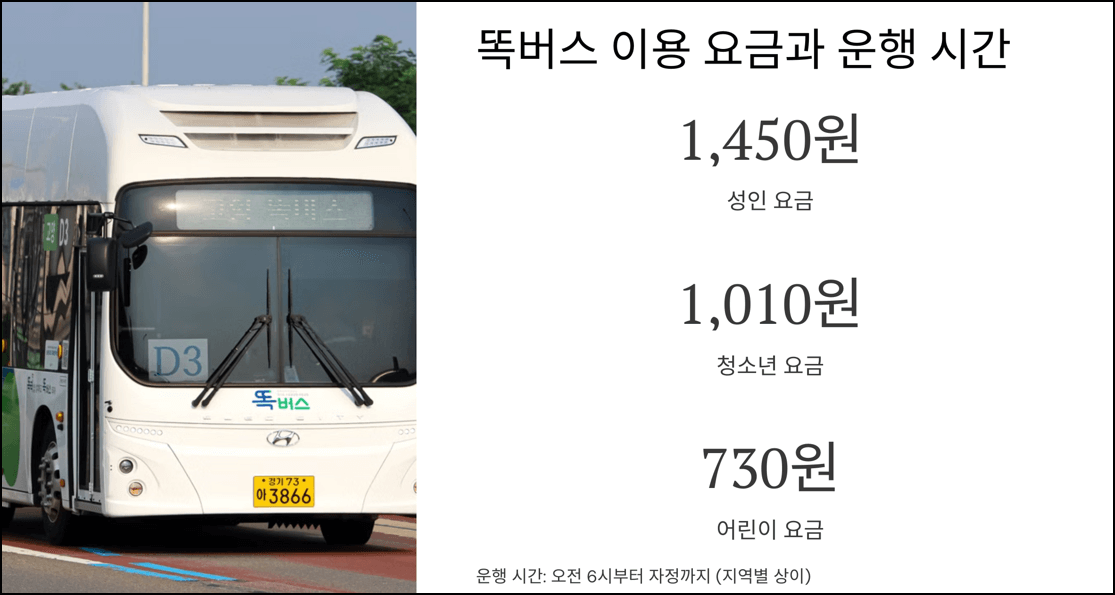 똑버스는 일반 시내버스 요금과 동일한 요금 체계를 적용하고 있으며, 수도권 환승할인 혜택도 받을 수 있습니다. 운행 시간은 지역별로 상이하니 자세히 확인하고 이용하시기 바랍니다.