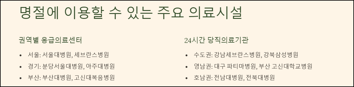 명절 연휴에는 평소 운영하지 않는 의료기관이 많기 때문에 응급 상황에 대비해 주요 의료시설을 알아두는 것이 중요합니다.
