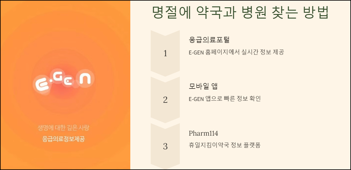 응급의료포털( E-GEN 홈페이지 )은 명절 기간 동안 병원과 약국 정보를 실시간으로 제공하는 서비스입니다.