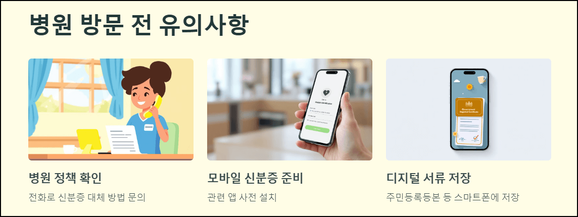 - 전화 문의: 병원마다 신분증 대체 방법이 다를 수 있으니 미리 확인하세요.