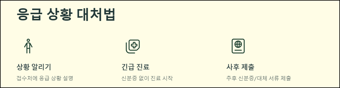 응급 상황에서는 병원에서 환자의 건강과 안전을 최우선으로 고려하기 때문에 신분증이 없어도 진료가 가능합니다. 아래 방법으로 대처하세요.