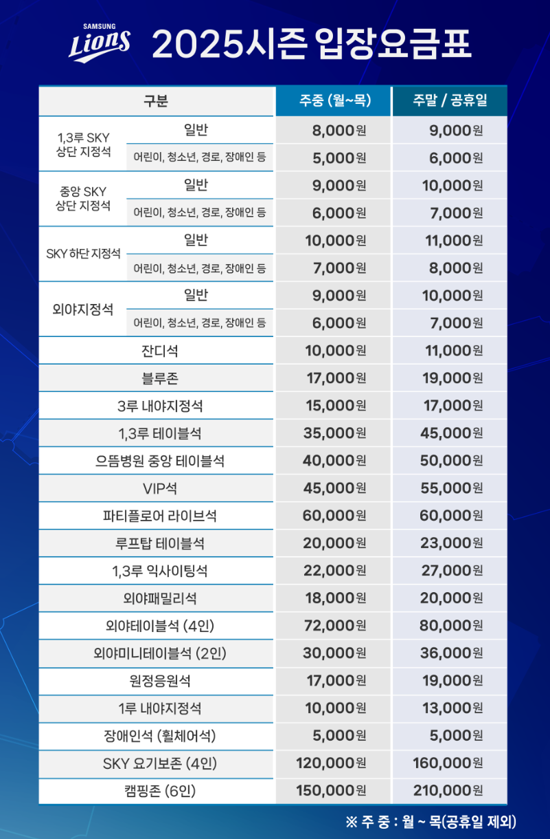 - 내야 지정석: 주중 25,000원 / 주말 30,000원