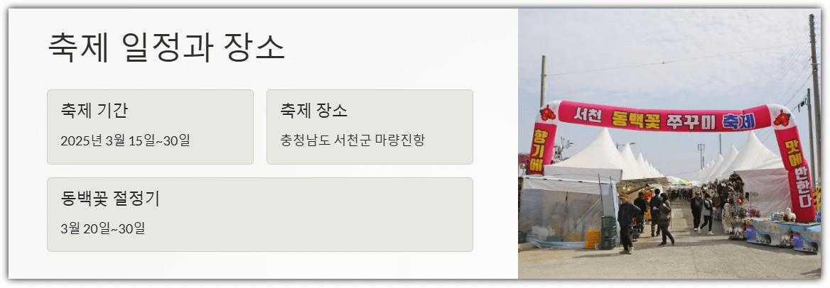 서천 동백꽃 주꾸미축제는 3월 중순부터 3월 말까지 개최됩니다.