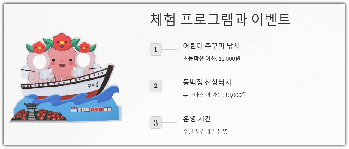 서천 동백꽃 주꾸미축제는 단순한 관람을 넘어 다양한 체험 프로그램이 준비되어 있습니다.