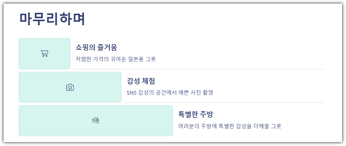 - 일본 감성의 소품과 그릇을 함께 구경하며 대화 유도 &