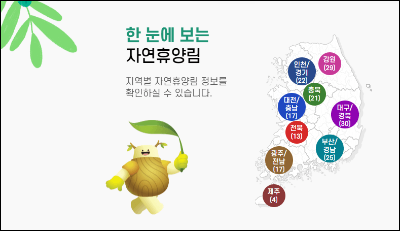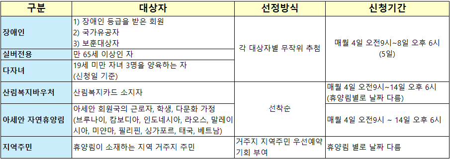 - 예약기간: 매월 4일 ~ 14일 (휴양림별로 신청기간이 다름, 아래 표 참고해 주세요)