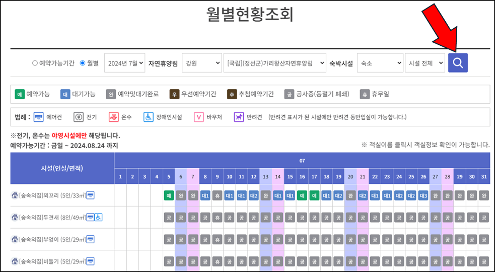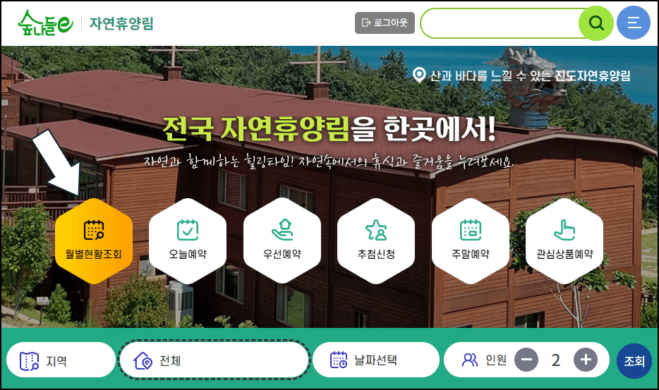 - 숲나들e 자연휴양림 예약 시 통합 예약보다는 월별 현황조회를 통해 예약하시면 현재 비어있는 객실을 확인하고 예약할 수 있어 편리합니다.