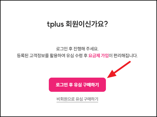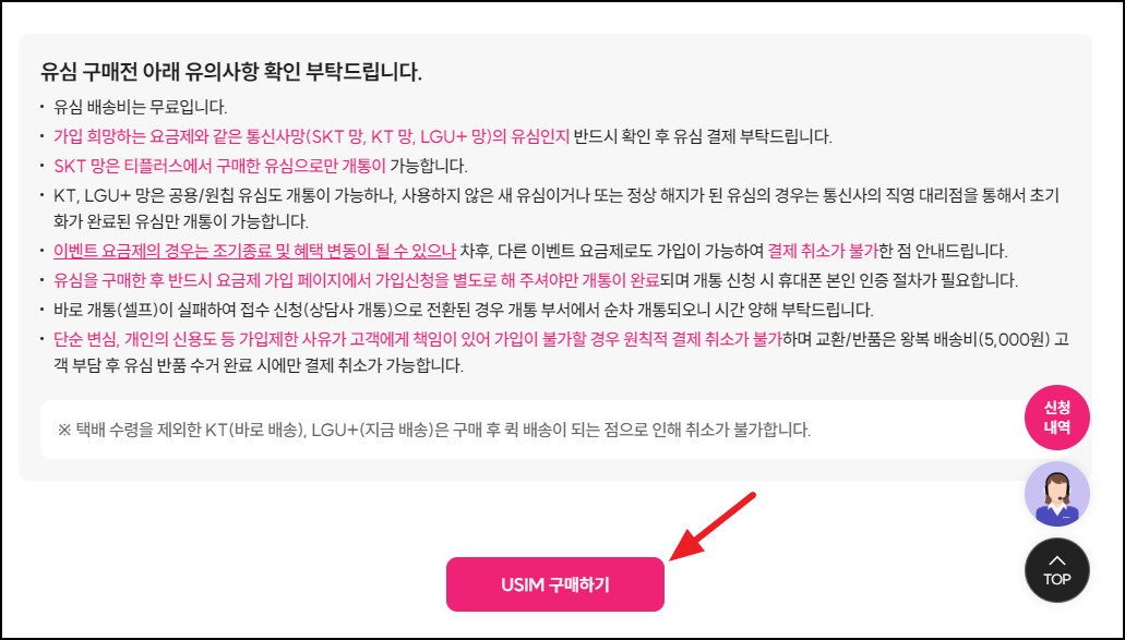 - 상단메뉴에서 요금제 → 유심구매 클릭